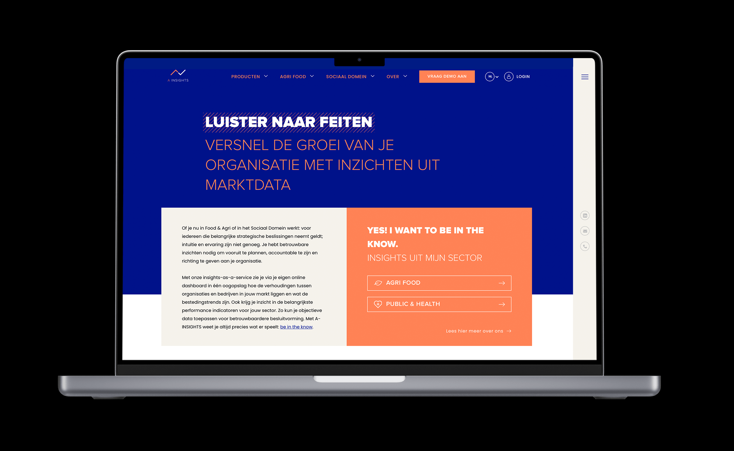 A-Insights offers companies that are active in the Food & Agri industry and organizations in the Public & Health sector fact-base insights derived from public market data; perfect for anyone who has to make key decisions that are too complex and important to base on gut instinct alone. We positioned the brand, created a new visual identity with a distinctive brand element – the x-ray pattern – and the theme: “be in the know.” Then we rolled everything out with a creative concept across various channels including a new website and online advertising.