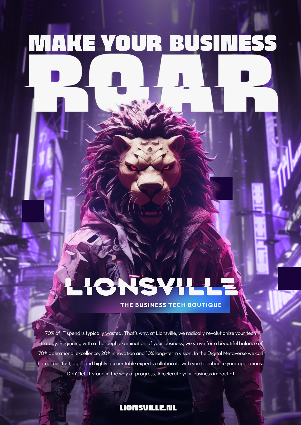 In close collaboration with Lionsville, we were responsible for their rebranding. We helped strategically position Lionsville from Brand Strategy to Brand Story and -Theme and create Lionsville’s Visual Identity and overarching 360-degree communication concept for years to come. Building on Lionsville’s Dutch can-do origins and international power to deliver across its clients’ full business spectrum, VENGEAN created the concept “Where business roars” and its matching Brand Theme, simply: “Roooaaar!” An unconventional approach in the world of global IT services and consulting that fits Lionsville’s exceptional company profile and its desire to progress and stand out.
