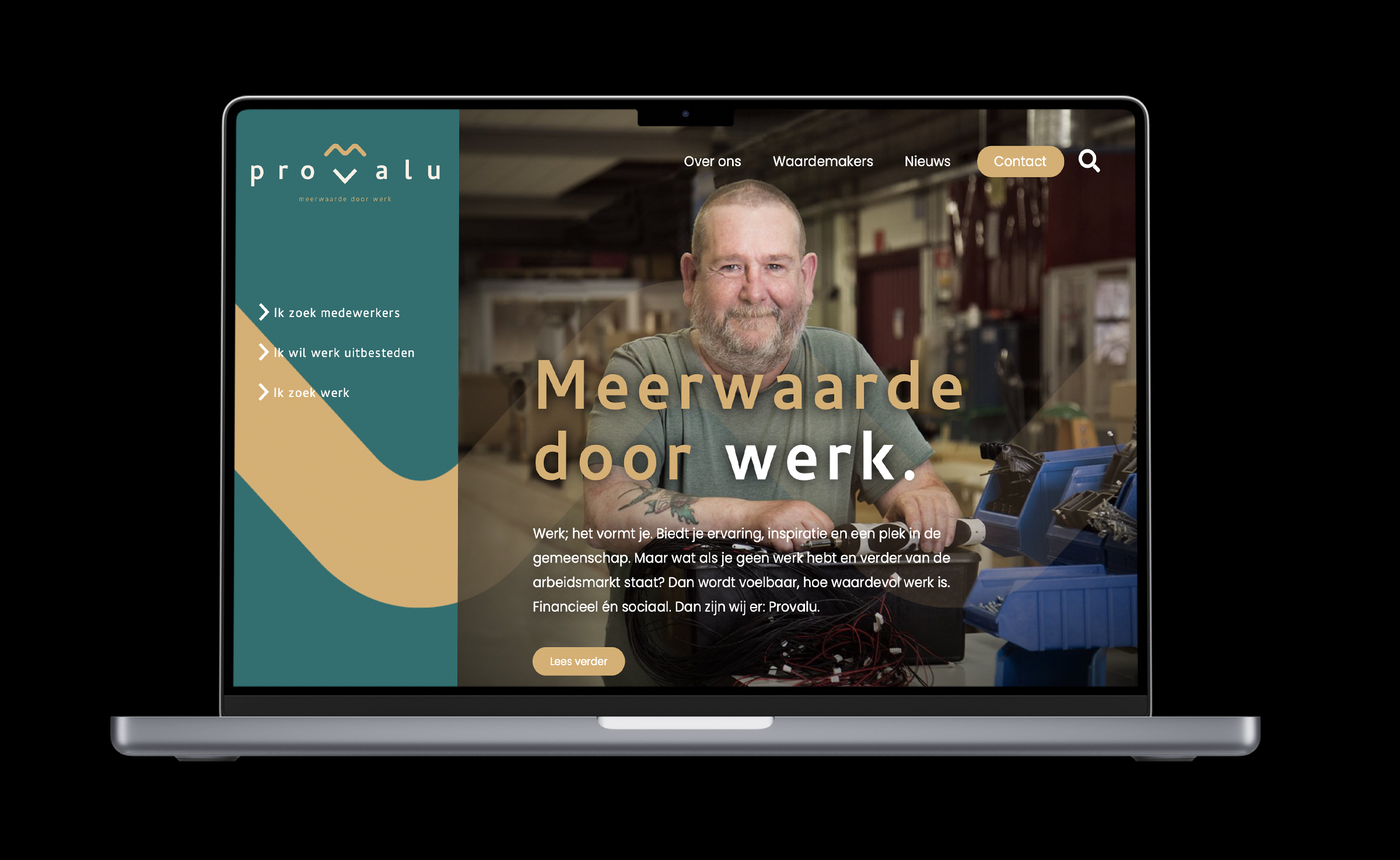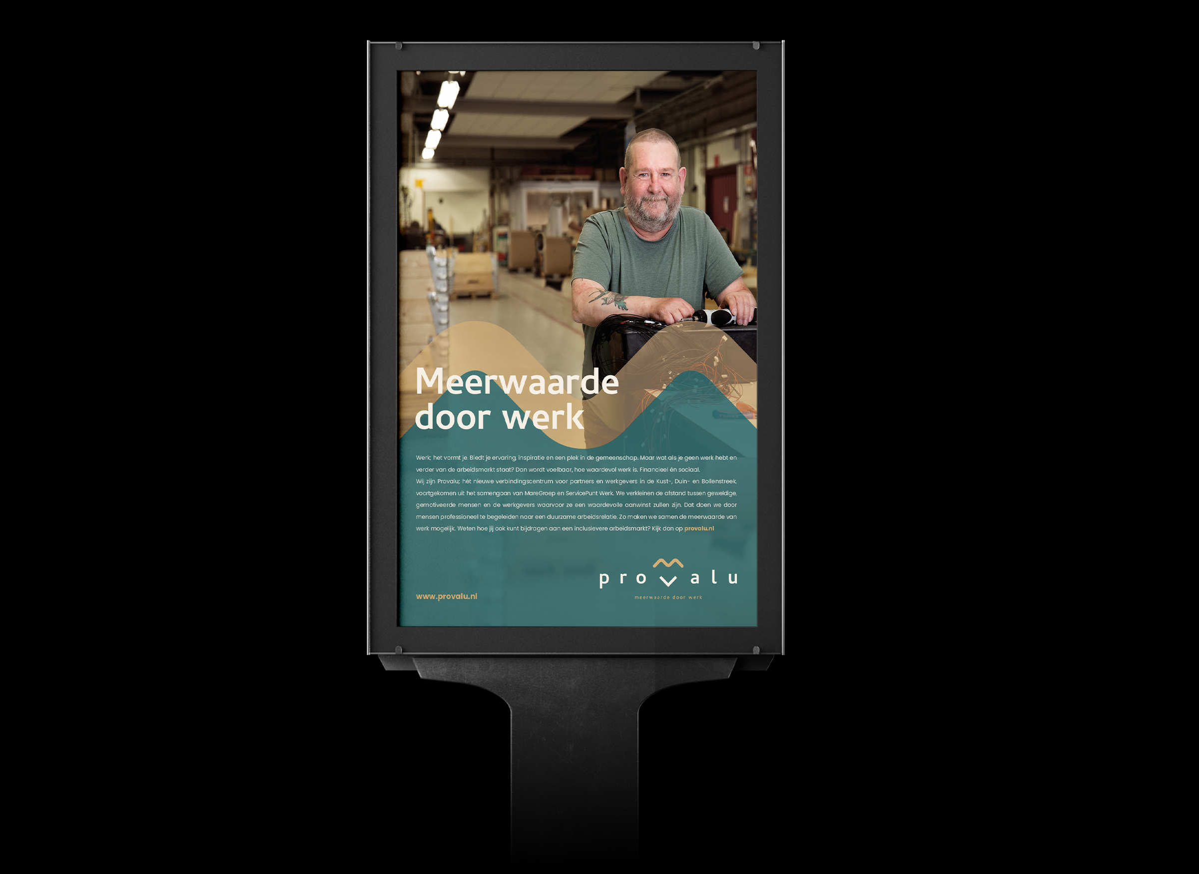 We merged two regional organizations – a sheltered workshop and factory and a public recruitment agency – into one successful brand by renaming them after a shared belief: “More (self)worth through work.” Provalu, born out of pro + value, connects great, motivated people with employees for whom they are of tremendous value. The nearby sea served as a powerful source of inspiration for the brand. We created a look and feel with modern, sea-themed colours and incorporated a wave and a heart for people as brand elements. The creative concept was rolled out across all media and channels, including print, press, PR, building signage, work clothing, fleet, website, online advertising, Social and stationary.