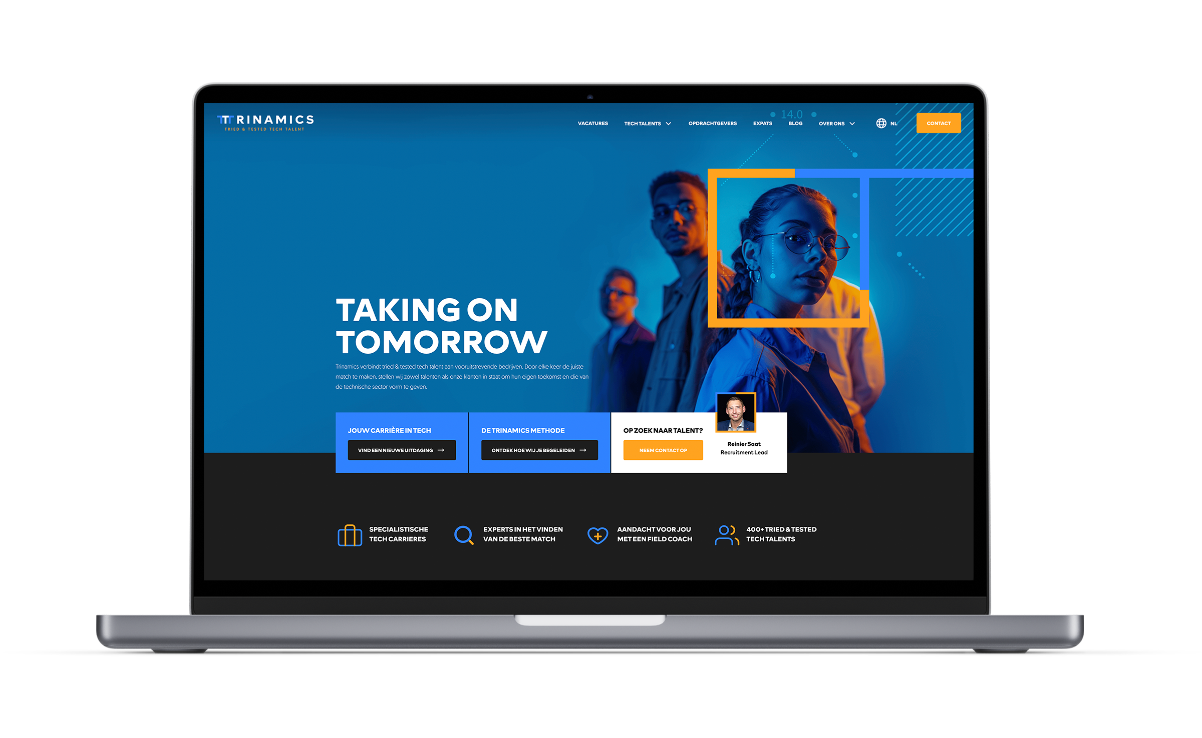 We developed the new brand strategy centered around the theme ‘Taking on tomorrow’, which reflects Trinamics’ commitment to supporting both clients and professionals in their growth and development. This enables them to secure their futures and play a larger role in shaping the tech industry. The strategy is brought to life through a bold visual identity, brand story, and a 360-degree communication concept.