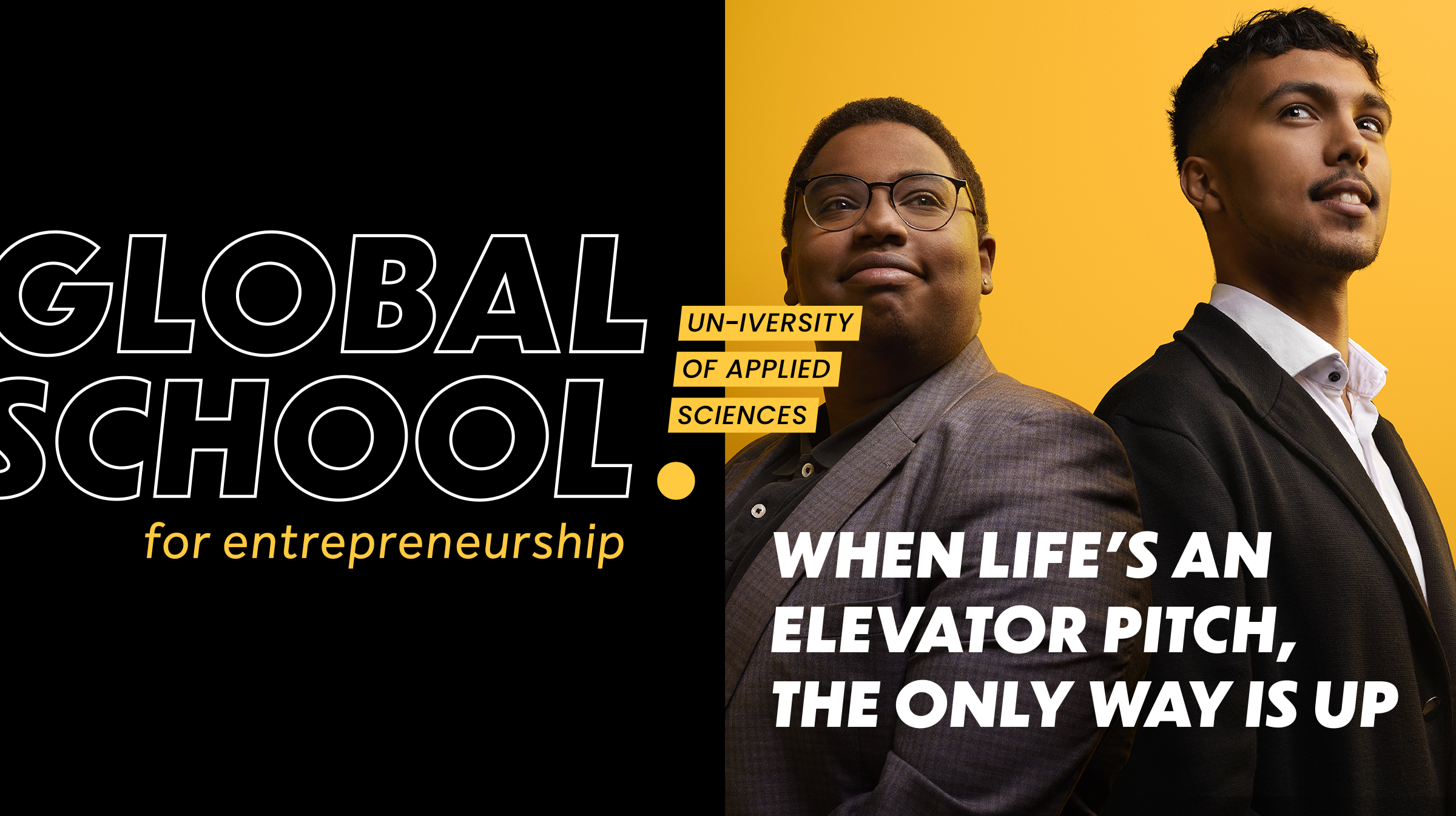 The accredited University of Applied Sciences Global School for Entrepreneurship is unlike any other educational institute for learning how to be an entrepreneur. So we positioned it not as a university but as an un-iversity and created a visual identity that shows that those who follow an education there are not students, but confident young entrepreneurs. From the day they enlist, students start their own company. And everything they undertake from that point on is learning to do business by being in business as they RISE! to fame as newly minted entrepreneurs.